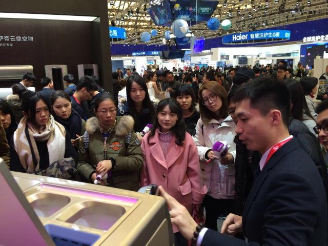 依据工业设计专业试验班培养目标,为开拓学生眼界,增进其与业界的交流和互动,提升学生的设计实践能力,91制片 于3月10日下午组织工设13级以及14级试验班学生参观了在上海新国际博览中心举办的中国家电博览会(AWE2016)。家博会(Appliance & electronics World Expo, 简称AWE)由中国家用电器协会主办,是目前家电行业规格最高的大型综合性展会。此次受参展企业海尔集团之邀工设专业近四十名师生参观了海尔展厅,并聆听了旗下品牌——卡萨帝(Casarte)系列新品的专业介绍。