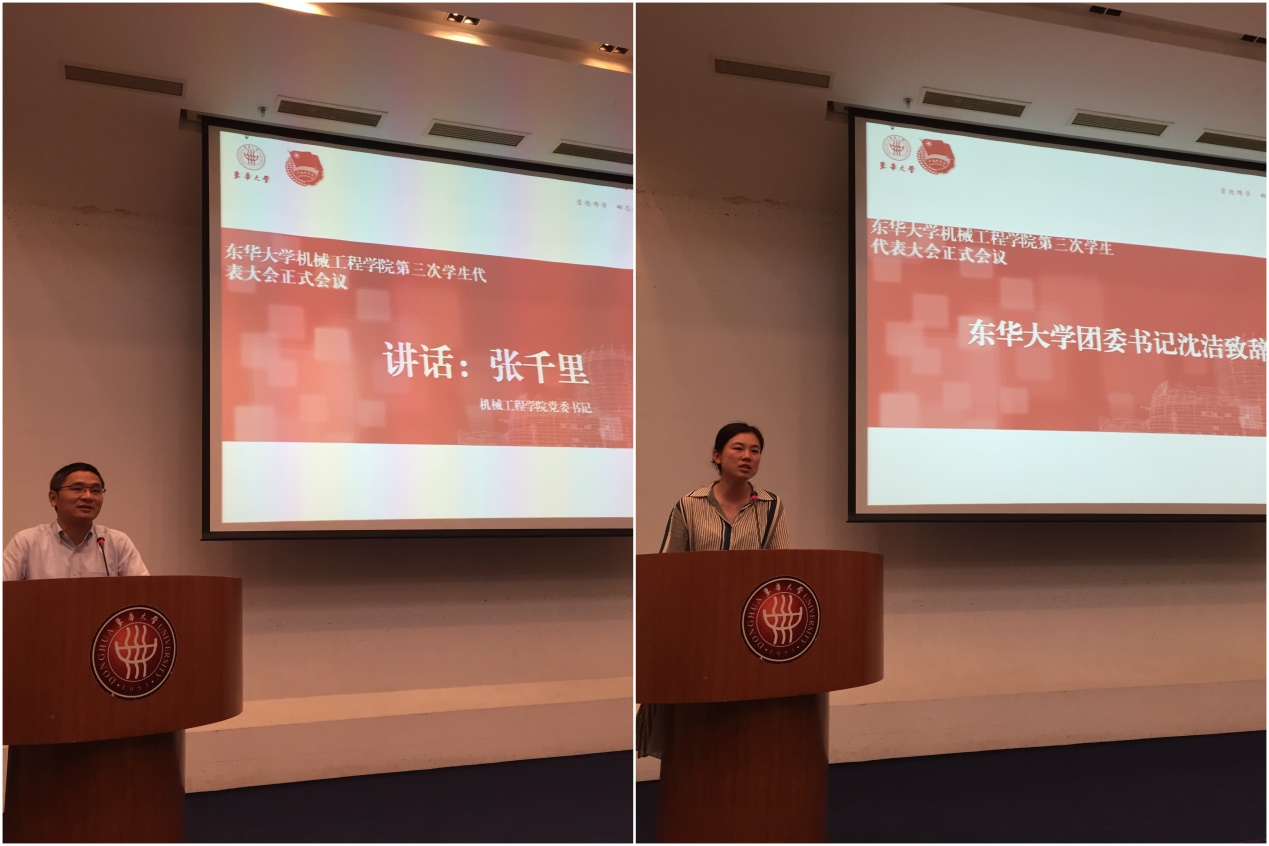 518日,机械学院第三次学生代表大会在松江校区图文信息中心第二报告厅举行。机械学院党委书记张千里、校团委书记沈洁、机械学院副院长唐智、机械学院党委副书记李宁蔚,兄弟学院团委书记代表、以及机械学院专兼职辅导员,机械学院全体学生代表、兄弟学院学生会代表与会。会议听取和审议机械学院学生会工作报告,机械学院研究生会工作报告,听取和审议学代会提案工作报告,选举产生机械学院第三届学生委员会委员和学生会新一届主席团。