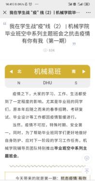 毕业班辅导员王晓晖老师积极利用易班平台发布“疫情之下,毕业班同学在行动”、“疫情之下,如何进行考验复试”、“疫情之下,就业我来帮”、“疫情当前,线上招聘面试需要注意哪些问题”等系列空中主题班会,在毕业班学生中引起热烈反响,累计观看达1500人次。