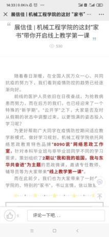 卓越机械1701班张广志同学评价:“32日是正式在线教学的第一天,学院在线教学给我最大的感受是快和稳。通过前期针对在线教学问题的及时、集中回应,大多数同学都很快适应了在线教育模式。通过微信、学习通、腾讯会议、直播等形式,师生间产生了更多的接触,对同学们学习起到了积极作用。我相信,在师生们的共同努力下,疫情不会影响到正常的学习生活,我们一起共盼春来。”