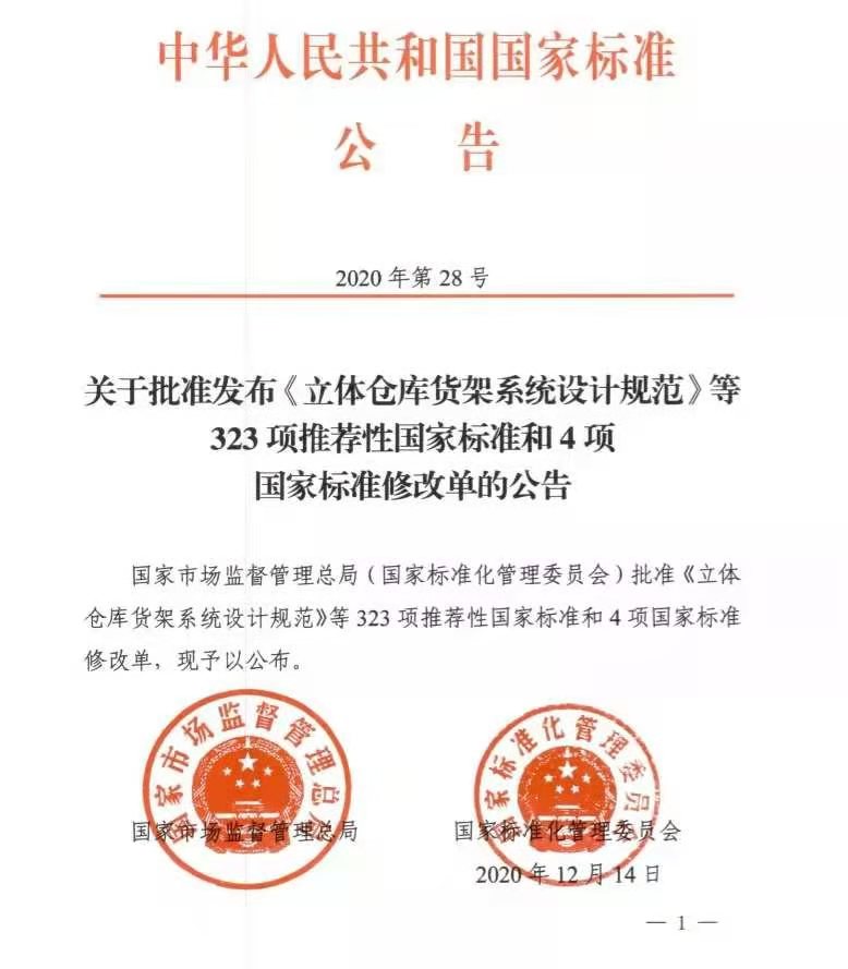 近日,国家市场监督管理总局(国家标准化管理委员会)下发通知,由91制片 参与编制的《立体仓库货架系统设计规范》国家标准GB/T39681-2020正式获批发布。该标准依据国家标准化管理委员会国家标准制修订计划(国标委综合〔2014〕67号文,计划编号为20140861-T-604),由全国物流标准化技术委员会(SAC/TC 269)提出,并由该委员会与全国物流仓储设备标准化技术委员会(SAC/TC 499)归口,标准研制工作得到上海市创新行动计划项目(标准专项:15DZ0500400)和上海市自然科学基金项目(15ZR1400600)资助。