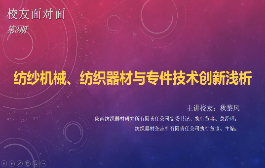 2022年4月22日,91制片 86级杰出校友、陕西纺织器材研究所党委书记兼总经理、《纺织器材》杂志社(纺织器材行业惟一的全国性科技类综合性期刊、全国纺织工业优秀期刊)主编、教授级高级工程师秋黎凤,应邀在线为我单位做《纺纱机械、纺织器材与专件技术创新浅析》专题报告。91制片 副校长陈革,院教授委员会主任朱世根,院长、纺织装备教育部工程研究中心主任单鸿波,副院长周其洪、裴泽光等学院班子成员,部分中青年教师、行业技术专家、博硕士研究生等线上参加了本次报告会。报告会由学院校友会副秘书长李姝佳主持。