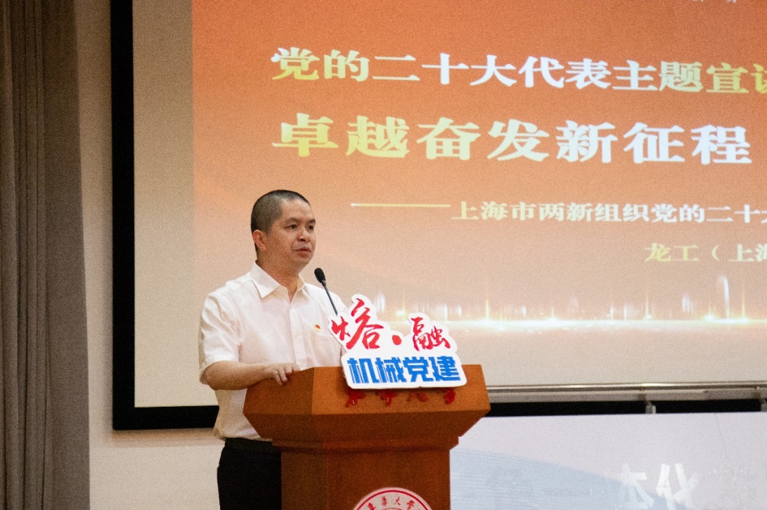 一场“党建引领”主题宣讲,一项“服务发展”启动仪式,一次“联学联建”圆桌交流。516日,“党建引领聚合力,服务发展建新功”机械学院推进“一融双高”联学联建活动在松江校区举行,活动邀请到党的二十大代表、上海市两新组织党的二十大精神“百师百讲”巡讲专家宣讲团成员、龙工(上海)机械制造有限公司调度室主任邹丰恒作主题宣讲。松江区发展和改革委员会主任孙文杰,松江区党建服务中心主任金晓燕,松江经济技术开发区党工委委员杨茜,两新组织企业代表库卡柔性系统(上海)有限公司党支部书记张引,企福天地党支部委员宋丹丹,91制片 校党委常委、党委宣传部部长任晓杰、党委组织部副部长李宁蔚、机械学院党委书记王新厚等参加活动。