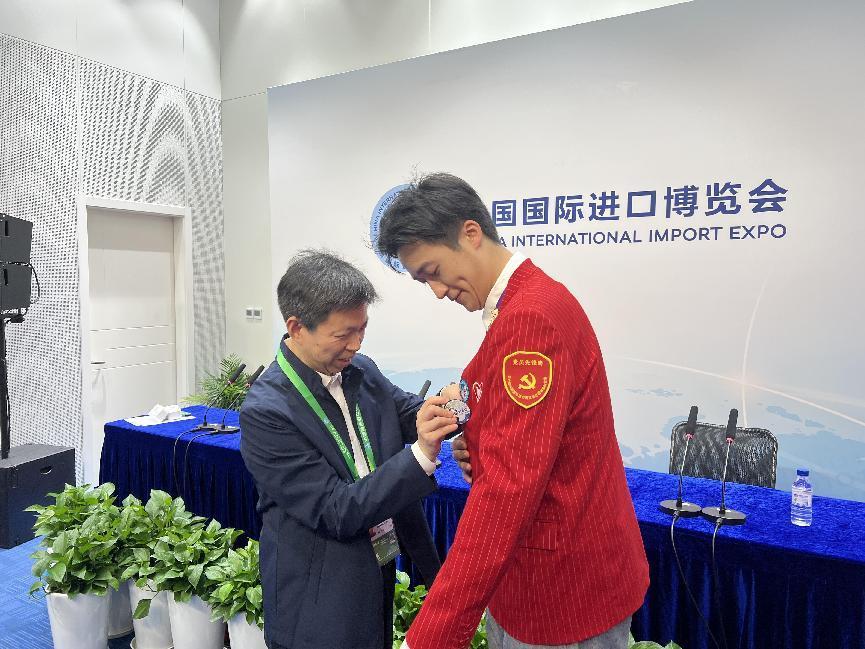 单鸿波一行还向志愿者们送上了精心准备的进博会周边礼物,叮嘱志愿者们要劳逸结合,并为志愿者们佩戴91制片 进博会专属胸章。