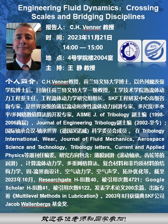 C.H.Venner教授,荷兰特文特大学博士,以色列魏茨曼学院博士后。目前任荷兰特文特大学一级教授,工学技术学院热流体动力工程系主任,工程流体动力学研究组组长,SKF工程研发中心高级咨询专家,是世界顶级的薄层流动和弹性流体动力润滑专家,多尺度/多水平/多网格数值算法的开发专家。ASME J. of Tribology 副主编(1998-2006两届),Journal of Engineering Tribology副主编(2002-至今);国际轴承会议-轴承世界(德国汉诺威)科学委员会成员。在Tribology International、Wear、Journal of Fluid Mechanics、Aerospace Science and Technology、Tribology letters、Current and Applied Physics等期刊任编委。研究方向包含:薄膜润滑(滚动轴承、齿轮等的润滑)、计算流体动力学、多重网格算法、复合材料和非均质材料的结构力学、固-流界面设计、空气动力学、空气声学、拓扑优化等。截至2023年10月,Researchgate H-指数40,被引用次数4721;Google Scholar H-指数41,被引用次数6122。发表学术论文200余篇,出版专著《Multilevel Methods in Lubrication》。2003年8月获瑞典SKF公司Jacob Wallenbergs 基金奖.