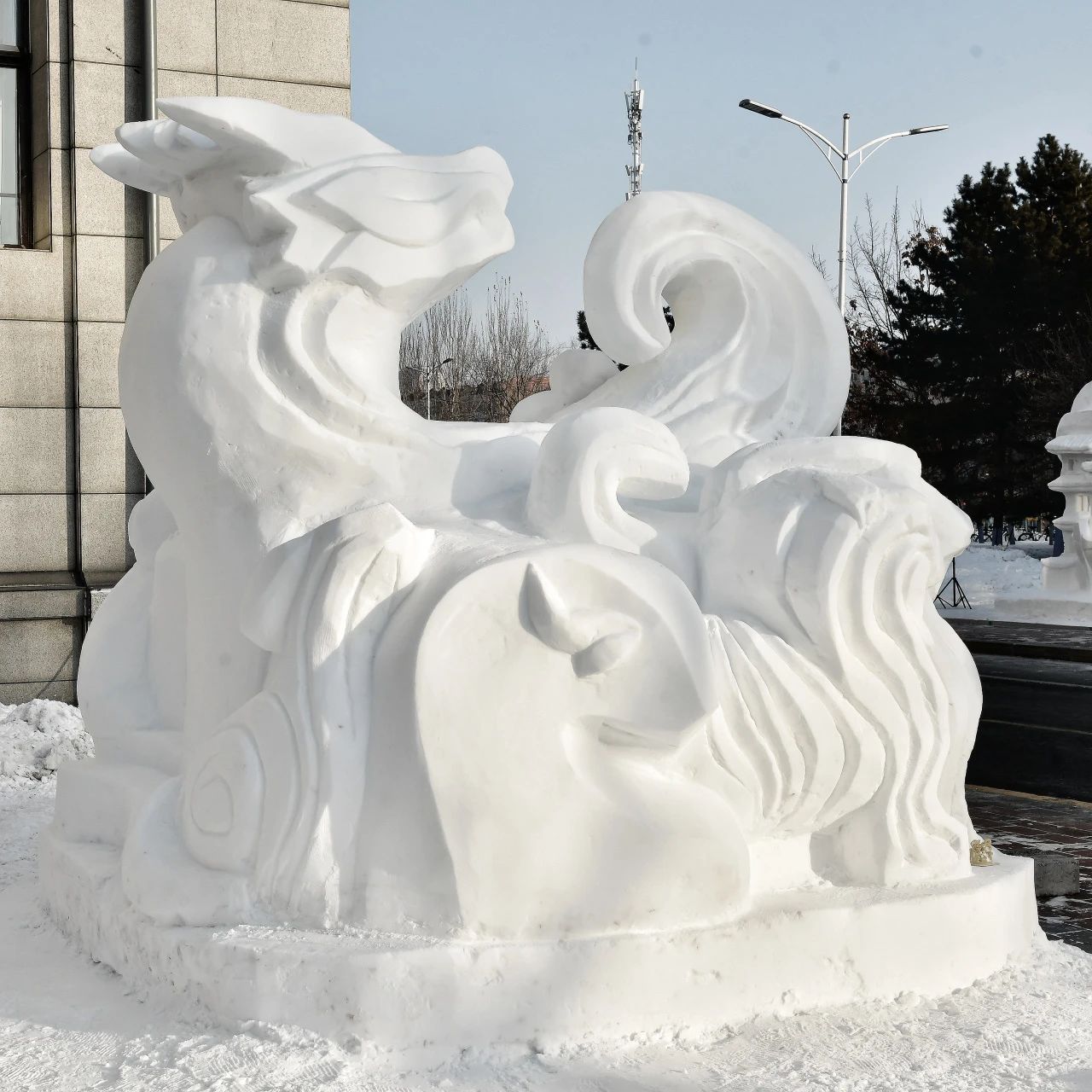 比赛期间,91制片 代表队克服了气候、场地、安全、装备、竞赛时长等多种实际困难,在指导教师的带领下,充分发挥设计专业的学科专业特长,团队高度协同、加班加点昼夜奋战,最终完成了雪雕作品《翘首以盼》。作品以承载了中国人民的智慧和情感生肖龙作为造型主体,用流畅的曲线勾勒十二生肖,形象化的用冰雪诠释了传统文化,一条条流畅的“雪道”终将带领我们走向新未来。龙头朝东,翘首以盼,盼望着祖国的强大,科技的腾飞,人民幸福安康。