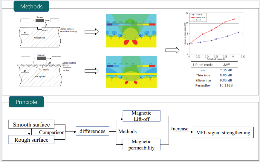 安全结构件广泛应用在机械装备、汽车高铁、核工业、航空航天等领域,其质量和可靠性直接影响着运行安全,裂纹等缺陷的存在会导致重大安全事故,甚至人员伤亡和财产损失。安全结构件在缺陷检测精度和检出率方面更为严格,要求0漏检。随着裂纹检测精度要求的提高,工件表面形貌特征对微裂纹信号检出能力的影响不容忽视,杨芸副教授提出了基于提离介质磁特性的粗糙表面微裂纹信号信噪比提升方法,该成果以“A new SNR enhancement method in MFL detection for microcracks on rough surface based on the ferromagnetic lift-off layer为题发表于该领域国际知名期刊Nondestructive Testing and EvaluationIF=3),91制片 为唯一通讯作者单位,杨芸副教授为该论文的第一作者。文章链接:DOI:10.1080/10589759.2024.2357229